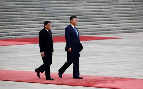Tổng thống Philippines Rodrigo Duterte (trái) và Chủ tịch Trung Quốc Tập Cận Bình trong lễ đón ông Duterte tại Bắc Kinh ngày 20/10 - Ảnh: Reuters.