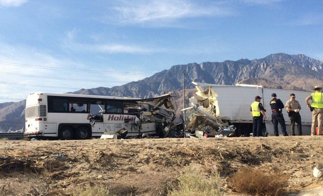Tai nạn xảy ra khi một chiếc xe bus chở khách Du lịch đâm vào đuôi chiếc xe tải đầu kéo trên xa lộ gần thành phố Palm Springs, cách Los Angeles 160km về phía Đông. Tại hiện trường, phần đầu xe bus và phần đuôi xe tải bị hư hỏng nặng.
