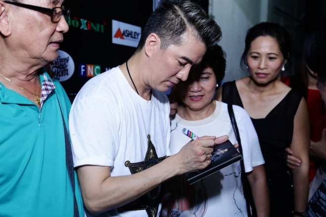 Mr. Đàm vui vẻ chụp hình "tự sướng" cùng các mạnh thường quân sau buổi đấu giá. Bên cạnh đó, một vị khách không mua được chiếc túi hàng hiệu mà nam ca sĩ rao bán cũng quyết định dành trọn 190 triệu đồng để ủng hộ cho quỹ của Mr. Đàm.