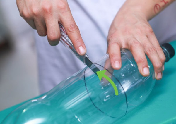 Dung dao rọc giấy rạch ngang thân chai Coca với tỷ lệ 1/3 tính từ nắp chai xuống sau đó cắt rời thành hai phần riêng rẽ.