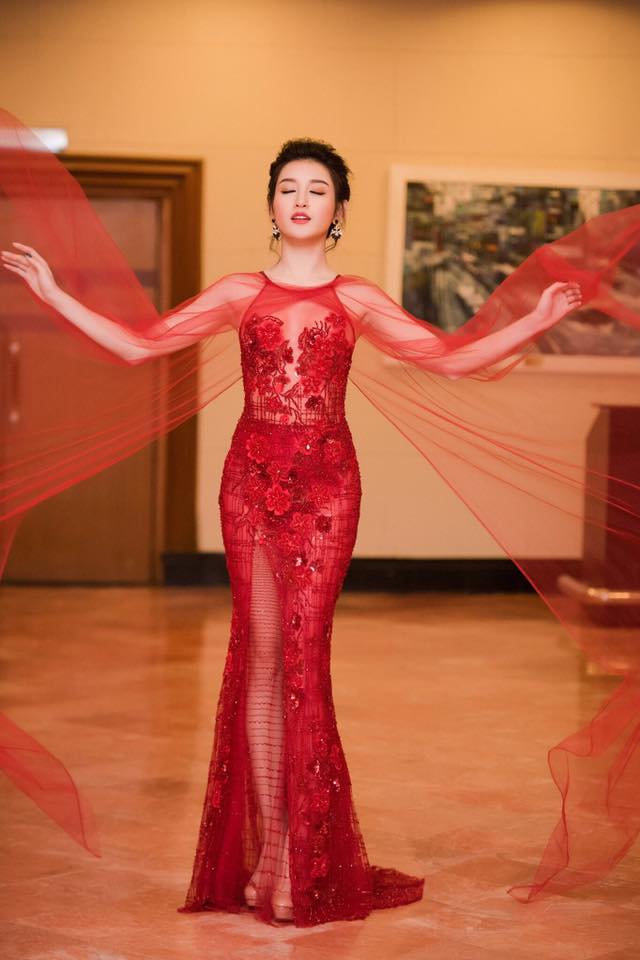 Sang trọng, quý phái và quyến rũ với chiếc váy đỏ được làm từ chất liệu vải xuyên thấu