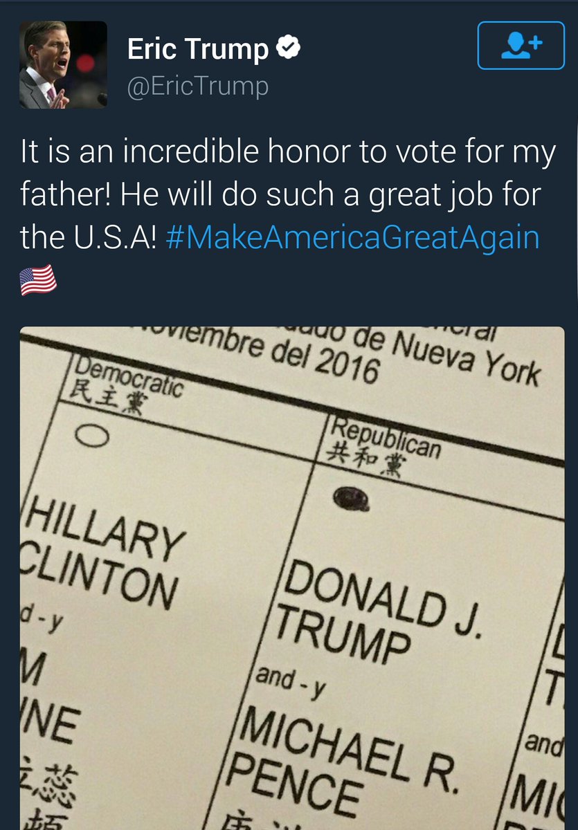 Eric, con trai thứ 2 của ông Donald Trump đã viết trên Twitter cá nhân của mình một dòng trạng thái và hình ảnh phiếu bầu được khoanh chọn tên cha anh.