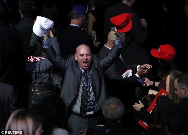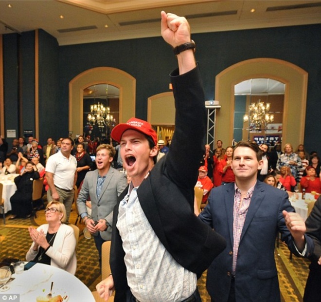 Những người ủng hộ Trump cởi bỏ chiếc mũ in câu khẩu hiệu quen thuộc trong chiến dịch tranh cử của nhà tài phiệt New York - "Khiến nước Mỹ vĩ đại trở lại" - cùng chia vui.