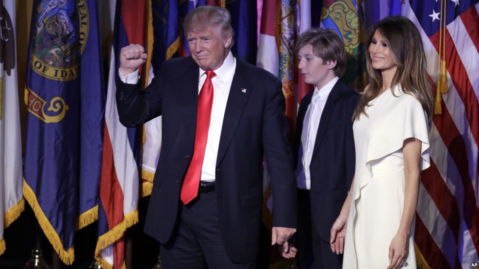 Tổng thống đắc cử Donald Trump cùng phu nhân và con trai út trước khi phát biểu sau khi giành chiến thắng hôm 9/11.