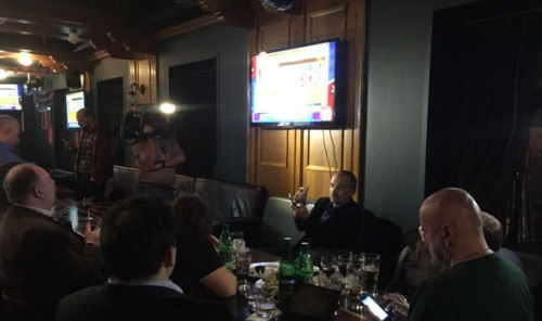 Trong một bữa tiệc của phái cánh hữu diễn ra tại Moscow, những người tham dự mặc chiếc áo phông in hình ứng viên tỉ phú bất động sản Donald Trump và hồi hộp theo dõi chờ đợi kết quả kiểm phiếu trong cuộc bầu cử Tổng thống Mỹ.