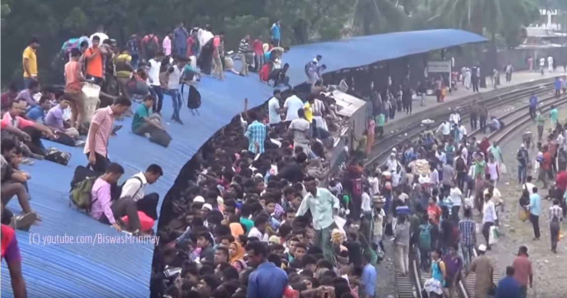 Một video ghi lại hình ảnh chờ tàu hỏa hành khách tại Bangladesh. Nhiều người cả phụ nữ và trẻ em phải đứng trên nóc nhà để chờ tàu tới. Rồi họ từ mái nhà nhày xuống nóc tàu để đi tiếp.