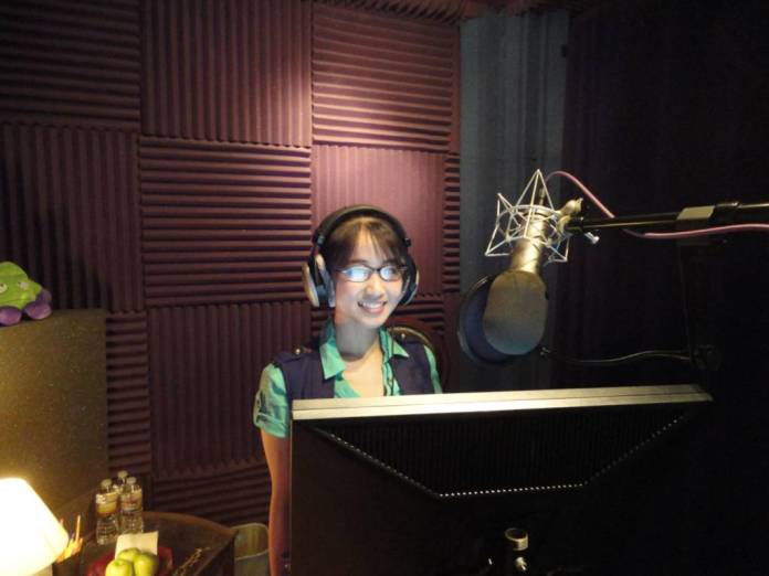 Xanthe Huỳnh đang lồng tiếng tại phòng thâu của Bang Zoom! Entertainment. (Hình: Xanthe Huỳnh cung cấp)