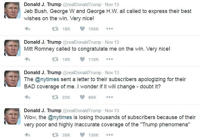 Trước đó, hôm 13.11, ông Trump chỉ trích báo New York Times đang mất hàng nghìn độc giả vì những thông tin nghèo nàn và sai trầm trọng về “hiện tượng Trump”, song tờ báo này cũng ngay lập tức phản hồi rằng lượng người đọc của họ đã tăng gấp 4 lần, chứng khoán tại công ty mẹ của New York Times đã tăng 9% kể từ ngày bầu cử.