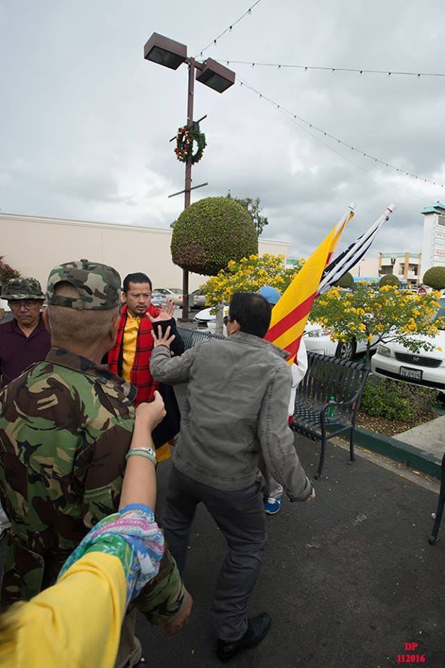 Rất nhiều người vây quanh hắn hô to: "Cộng sản cút đi". Có tiếng hô "Lột đồ nó ra coi có mặc áo đỏ bên trong không?". Tức thì có ba người đàn ông xông vô giật cái nón hắn đang đội trên đầu xuống coi có gì trong đó ko, người khác nắm vạt dài màu vàng dở cao lên coi bên trong hắn ta mặc áo gì thì chỉ thấy cái áo thun màu xanh dưa cải lợt chớ không có áo gì nữa. Những người khác đang cầm ly cà phê sữa đá, nước ngọt trên tay liền hất thẳng vô ngực áo hắn.