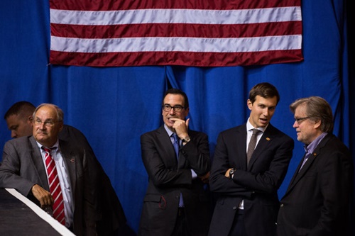 Chiến lược gia trưởng cho ông Trump Stephen K. Bannon (ngoài cùng bên phải) thường xuyên phải tìm tới Kushner để xin lời khuyên.