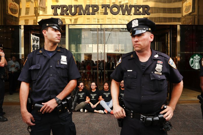 Cảnh sát canh gác tại tòa nhà này, nằm ở mé Đông của đại lộ Fifth Avenue, đoạn giữa các đường 56 và và đường 57, chận và chất vấn những người chỉ muốn cuốc bộ ngang qua tòa nhà của ông Trump.Trong trường hợp những người đó không có mục đích đi vào Trump Tower hoặc các thương hiệu Tiffany và Gucci cùng dãy phố, họ bị cảnh sát bắt phải qua bên kia đường và đi nốt đoạn còn lại.