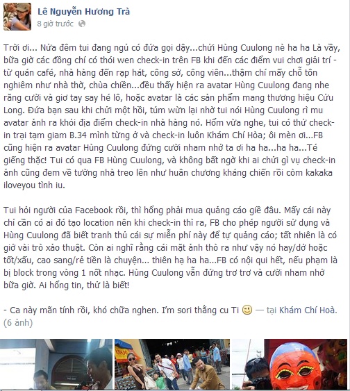 Người SG check-in ở đâu cũng thấy mặt Hùng Cửu Long, Đến nghĩa địa cũng ko tha, ông này điên quá. Nhưng ông này cũng biết chớp lấy thời cơ , PR ko tốn tiền tội gì ko làm :p