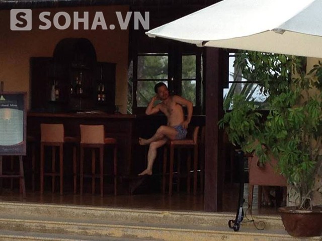 Chân dài Hùng CL cởi trần, mặc quần đùi, vắt vẻo ngồi trong quán. Laughing