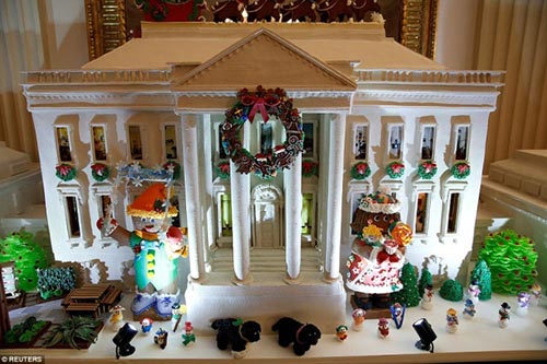 Mô hình Nhà Trắng được làm từ 68 kg bánh gừng ở bên trong, 45 kg bột mỳ bên ngoài, 9 kg bột kết dính cùng kem phủ và đường tạo hình. Truyền thống làm Nhà Trắng bằng bánh gừng có từ những năm 1970 và được đặt trong phòng Quốc yến từ thời chính quyền Nixon. Ảnh: Reuters