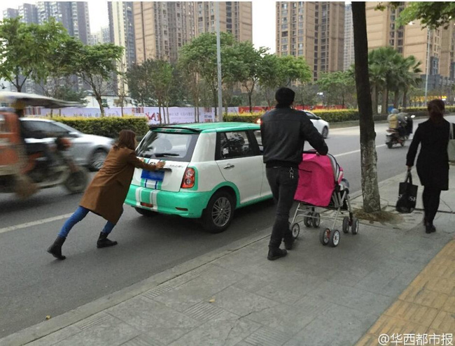 Hình ảnh người phụ nữ gồng mình đẩy chiếc ô tô hết nhiên liệu trong khi anh chồng thảnh thơi đẩy xe nôi chầm chậm bước đi trên vỉa hè hiện đang gây bão mạng xã hội Trung Quốc.