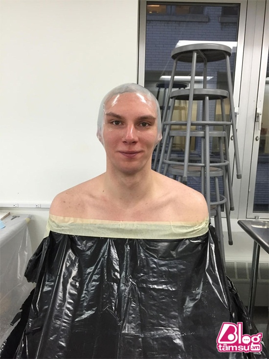 Đầu tiên, gương mặt của anh chàng được lấp kín bởi hỗn hợp alginate với nước. Nhân viên trang điểm sẽ tạo dần các bộ phận trên gương mặt anh ta. Hai lỗ mũi được để hở giúp anh chàng có thể hít thở.
