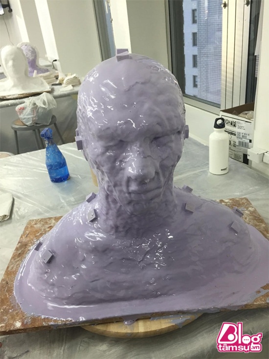 Tiếp đó một lớp silicon được đổ lên bên ngoài. Bên cạnh lớp silicon thì sẽ có thêm một lớp thạch cao bao bọc lấy khuôn mặt để thợ trang điểm có thể chạm khắc khuôn mặt của anh chàng.