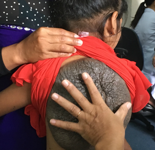 Phần bướu đen trên lưng cô bé có nhiều rãnh rộng trông như mai rùa.