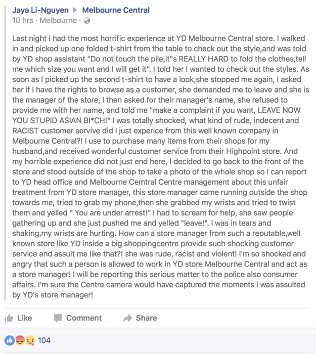 Vào sáng hôm nay, trên trang mạng của Melbourne Central đã xuất hiện lời than phiền của cô Jaya Li-Nguyen về cách hành xử của cửa hàng yd. tại đây.
