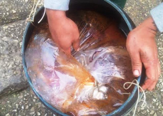 Tại trụ sở Công an xã Hải Lộc, cặp vợ chồng này khai nhận được chủ cơ sở Hoàng Thắng thuê đi đổ trộm chất thải tẩy rửa chế biến mực tươi ra biển vào địa bàn đầu cồn bãi ngang xã Hải Lộc. Cứ 3 ngày lại đi đổ trộm một lần.