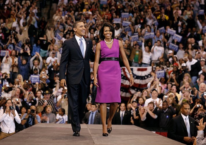 Vợ chồng Tổng thống Obama mặc tông-xuyệt-tông trong một sự kiện. Ảnh GD