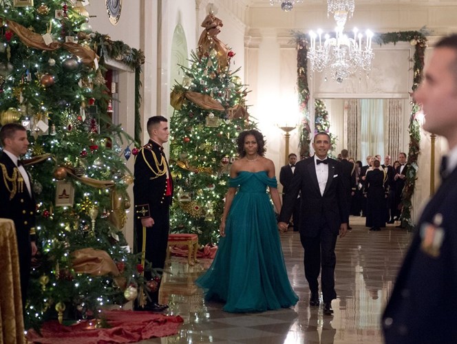 Đệ nhất phu nhân Michelle Obama toát lên vẻ đẹp đằm thắm, quyến rũ, quý phái khi diện đầm xanh dáng dài thướt tha hở vai trần. Ảnh GD