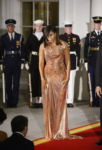 Một khoảnh khắc đẹp khác của Đệ nhất phu nhân Michelle Obama khi bà mặc chiếc váy Versace màu bạc trong dịp tiếp đón Thủ tướng Italy Matteo Renzi ở Nhà Trắng. Ảnh GD