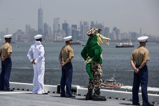 Lính thủy đánh bộ, thủy thủ và một chú "cá sấu" linh vật trên tàu đổ bộ USS Bataan thực hiện nghi thức chào tàu khi diễn ra cuộc diễu hành trong tuần lễ hạm đội hải quân ở New York tháng 5/2016.