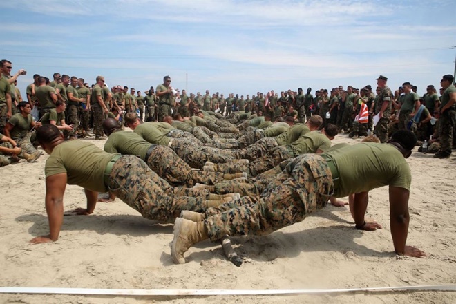 Màn chống đẩy tập thể của Thủy quân lục chiến Mỹ trước khi bắt đầu trò chơi kéo co tại trại huấn luyện ở North Carolina.