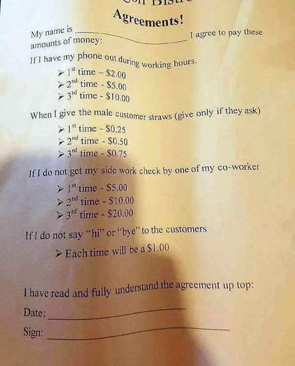 Hình chụp quy định về tiền phạt đã liệt kê những điều mà nhân viên có thể bị phạt nếu không làm hoặc làm. Chẳng hạn nếu nhân viên không chào “Hi” hoặc “Bye” với khách hàng, thì nhân viên sẽ bị phạt $1 Mỹ kim mỗi lần.