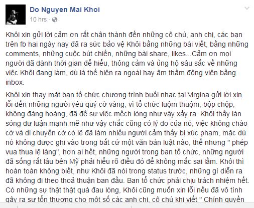 Khôi xin thay mặt ban tổ chức chương trình buổi nhạc tại Virgina gửi lời xin lỗi đến những người yêu quý cờ vàng, vì tổ chức luộm thuộm, bộp chộp, không đàng hoàng, đã để sự việc mếch lòng như vậy xảy ra. Khôi thấy làn sóng dư luận mạnh mẽ như vậy chắc cũng có lý do của nó, việc không chào cờ và di chuyển cờ có lẽ đã làm nhiều người cảm thấy bị xúc phạm, mặc dù nó không được ghi vào trong bất cứ một văn bản luật nào, thế nhưng " phép vua thua lệ làng", hơn ai hết, những người trong ban tổ chức, những người đã sống rất lâu bên Mỹ phải hiểu rõ điều đó để không mắc sai lầm. Khôi thì hoàn toàn không biết, như Khôi đã nói trong status trước, những gì diễn ra đã không đi theo thoả thuận ban đầu. Ban tổ chức phải chịu trách nhiệm hết.
