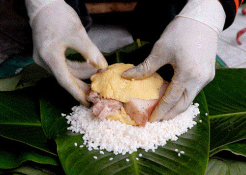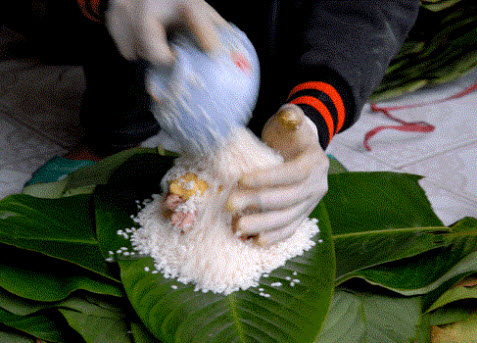 Khi gói bánh chưng, bạn phải chú ý thứ tự các loại nguyên liệu