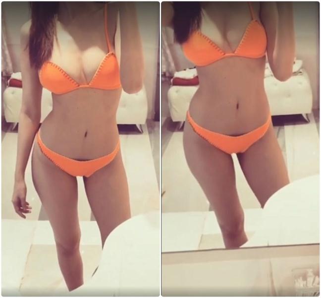 Điều khá táo bạo trong đoạn clip này là bạn gái của tỷ phú Hoàng Kiều diện bộ trang phục bikini màu cam nóng bỏng khoe khéo thân hình đồng hồ cát cùng vòng eo 56cm "vạn người mê" dù đã có bạn trai 72 tuổi.