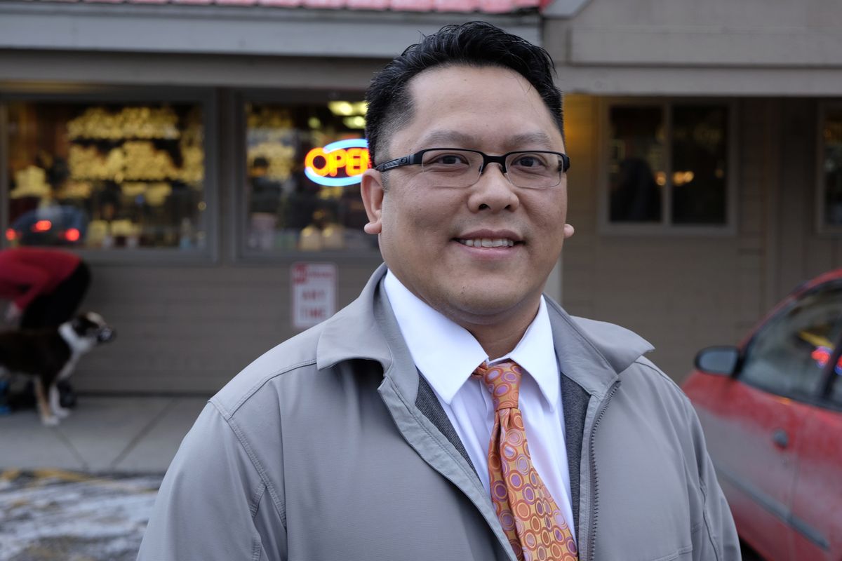 Anh Dale Trần, giám đốc tài chánh của công ty Kaladi Brothers Coffee, đang đứng trước một chi nhánh trên đường Brayton Drive ở Anchorage, Alaska ngày 1 tháng Một, 2016. (Marc Lester / Alaska Dispatch News)