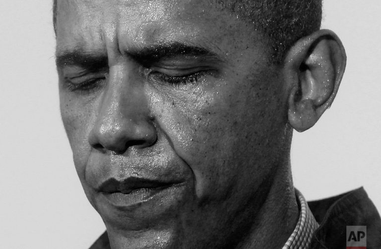 Đứng dưới mưa, Tổng thống Obama ngừng lời khi đang phát biểu trước các phóng viên tại trụ sở lực lượng bảo vệ bờ biển Venice khi ông tới thăm vùng duyên hải Vịnh Mexico của Mỹ, khu vực bị ảnh hưởng bởi sự cố tràn dầu của tập đoàn dầu khí BP – Ngày 2/5/2010.