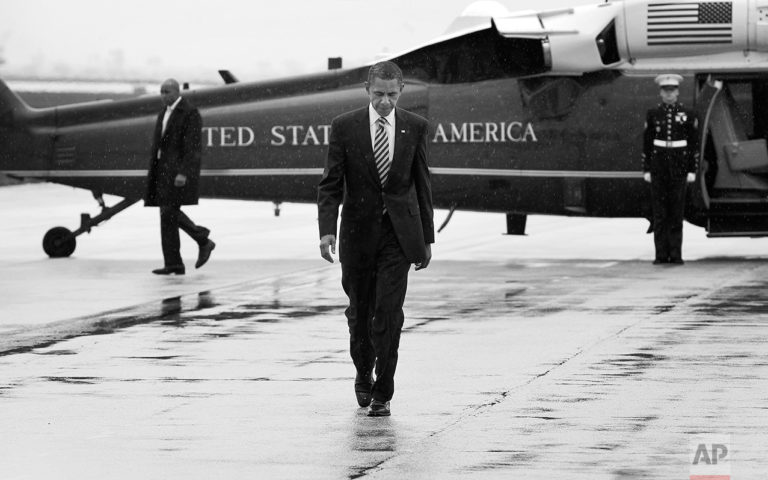Trời đổ mưa phùn nhẹ khi Tổng thống Obama bước trên đường băng ở Chicago để di chuyển tới New York tham gia các sự kiện gây quỹ tranh cử – Ngày 27/4/2011.