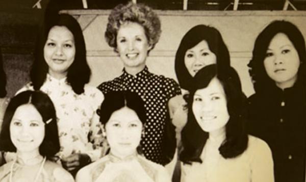 Bà Tippi Hedren (Áo đen chấm trắng- giữa) chụp hình chung với những người thợ nail người Việt đầu tiên.