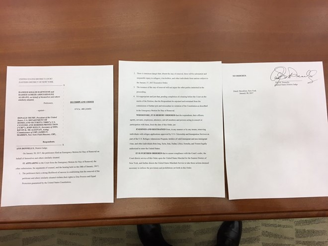 Những tiếng kêu khóc vì bị chia cắt người thân, các yêu cầu khẩn cấp đề nghị ngừng trục xuất của ACLU đã tới được văn phòng của bà Donnelly tại New York. Từng là một luật sư nhà nước nhưng Donnelly không mất nhiều thời gian để lắng nghe lập luận trong đêm 28/1.