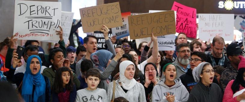 Sắc lệnh cấm cư dân bảy quốc gia Trung Đông -Iran, Iraq, Libya, Somalia, Sudan, Syria và Yemen- vào lãnh thổ Hoa Kỳ được ông ký vào lúc 4:42 chiều thứ Sáu, 27 tháng Giêng, 2017. Trưa hôm sau, vài trăm hành khách người Trung Đông bị viên chức an ninh giữ lại một vài phi trường Hoa Kỳ, quan trọng nhất là hai phi trường Dulles International Airport tại Washington và Kennedy Airport, tại New York.