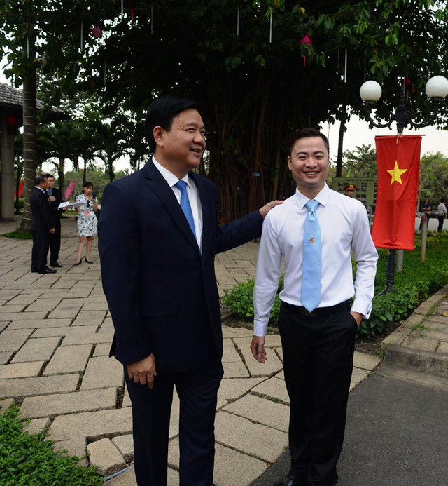 Bí thư Thành ủy TPHCM Đinh La Thăng vui vẻ trò chuyện cùng bác sĩ Trần Hoàng Minh (quốc tịch Mỹ), học Trường ĐH Houston (Mỹ) và tốt nghiệp ĐH Queensland (Úc) đã chọn về Việt Nam làm việc tại bệnh viện Gò Vấp (TPHCM)