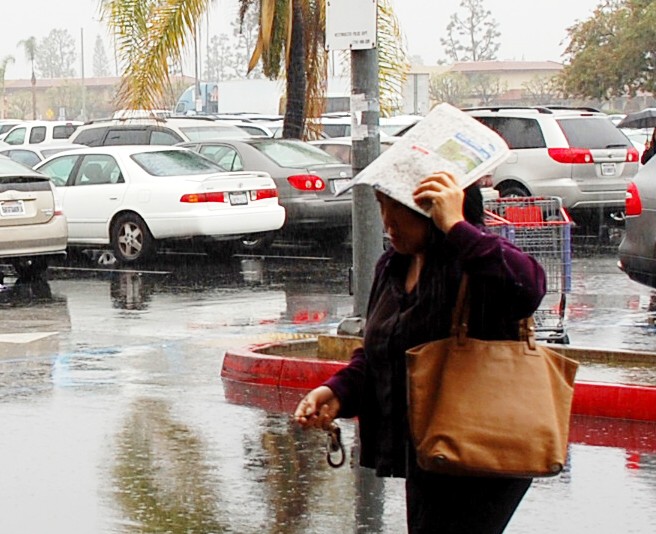 Một người đi trong mưa trong bãi đậu xe trước chợ ABC ở Bolsa ngày thứ Hai, 6 tháng 2, 2017. (Phúc Quỳnh/ Viễn Đông)