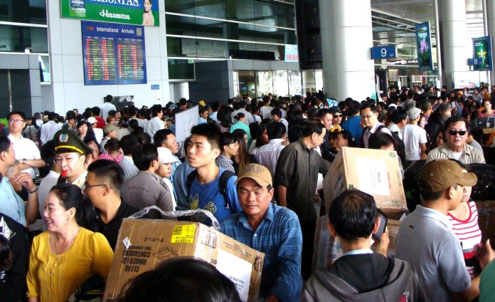 Người thân chen chân nhau đón Việt kiều về Việt Nam ăn Tết Đinh Dậu tại phi trường Tân Sơn Nhất. (Hình: Bình Lâm/Người Việt)