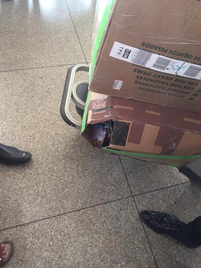Thùng hàng bị rạch lấy rươu, dầu thơm và kẹo M&M của Huỳnh Chánh (Hình: Huỳnh Chánh cung cấp)
