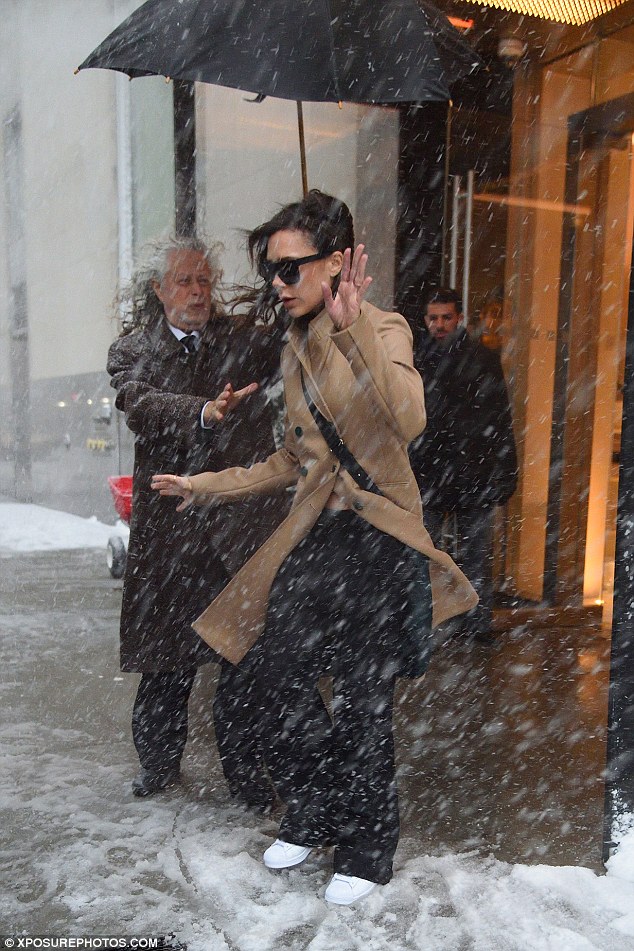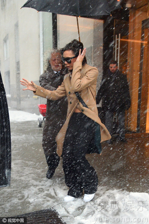 Trong cơn bão tuyết, ca sỹ Victoria Beckham được nhìn thấy đi ra khỏi một khách sạn để lên xe ô tô rất khó khăn. Khi gió tuyết liên tục ập tới, cô cũng phải “liêu xiêu” lúc di chuyển, theo Daily Mail.
