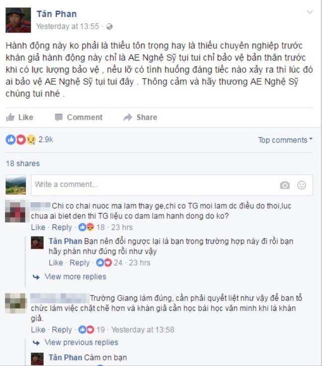 Nam nghệ sĩ chia sẻ: "Hành động này không phải là thiếu tôn trọng hay là thiếu chuyên nghiệp trước khán giả. Hành động này chỉ là anh em nghệ sĩ chúng tôi bảo vệ bản thân trước khi có lực lượng bảo vệ. Nếu lỡ có tình huống đáng tiếc nào xảy ra thì lúc đó ai bảo vệ anh em nghệ sĩ chúng tôi đây? Thông cảm và hãy thương anh em nghệ sĩ chúng tôi nhé".
