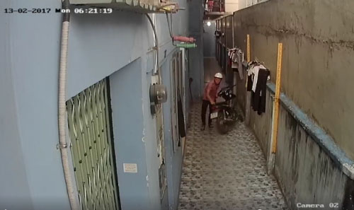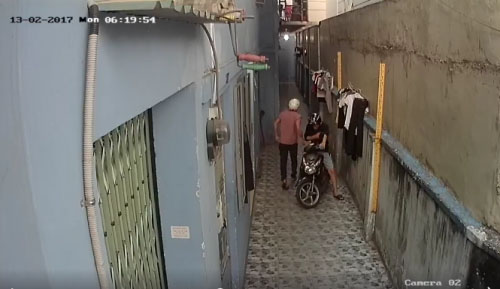 Hình ảnh ghi lại được từ camera giám sát cho thấy, hai thanh niên điều khiển xe máy đi vào một xóm trọ. Tên mặc áo đỏ đi bộ vào trong để quan sát tình hình, tên còn lại đứng ngoài canh chừng.
