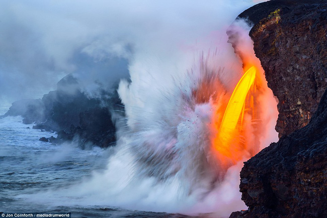 Nhiếp ảnh gia Jon Cornforth đã dũng cảm vượt qua những thách thức nguy hiểm hơn cả bom đạn để "chộp" được những khoảnh khắc nham thạch núi lửa phun trào hòa vào dòng nước biển.