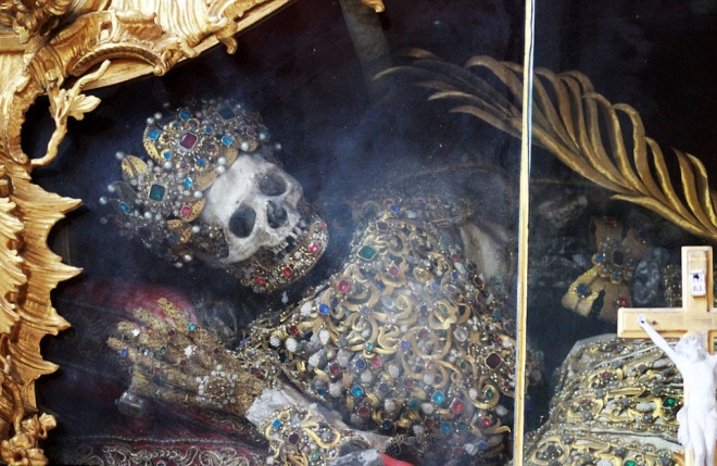 Một trong hai vị thánh, Hyacinth bị cho là bỏ đói đến chết tại Rome khi mới 12 tuổi. Quanh bộ xương này được nạm ngọc và trang phục làm từ vàng óng ánh.