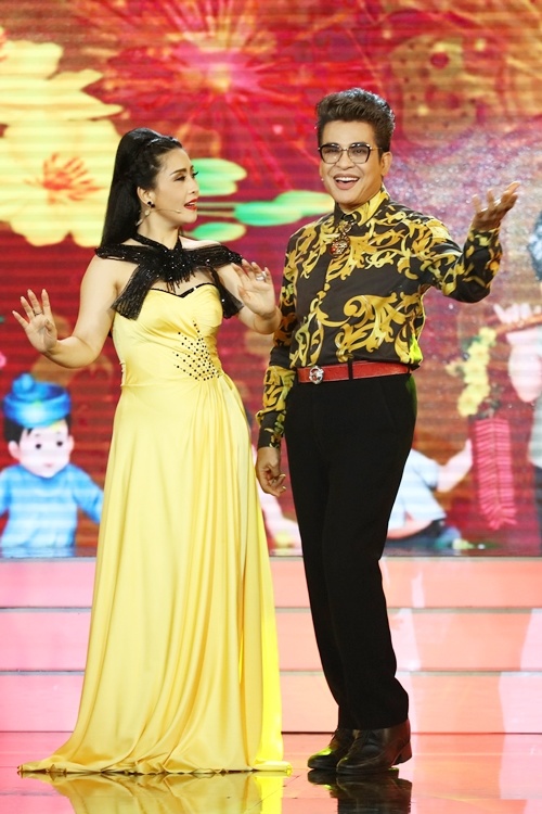 Trong tập bốn chương trình Cặp đôi hài hước, Việt Trinh (phải) và Lý Hùng cùng diện trang phục truyền thống. Nữ diễn viên mặc yếm, đội mấn, thân mật bên "người tình màn ảnh".
