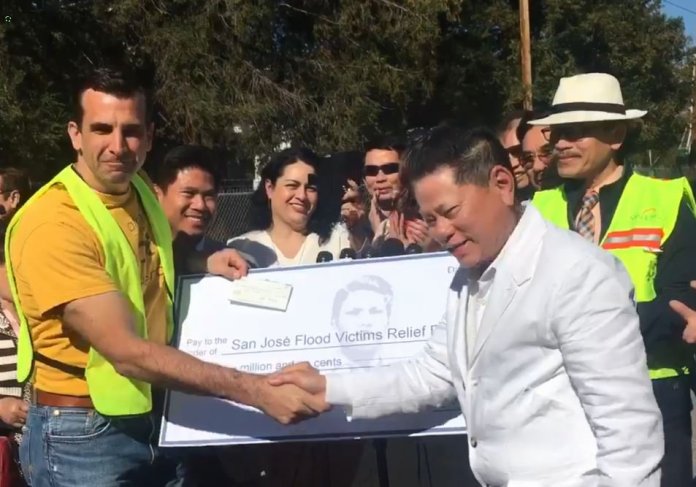 SAN JOSE, California (NV) – Tỷ phú Hoàng Kiều vừa ký một chi phiếu $5 triệu cho thành phố San Jose để giúp cư dân San Jose bị lụt, tại cuộc họp báo ở History Park trên đường Phelan, lúc 2 giờ chiều Thứ Tư, 1 Tháng Ba.